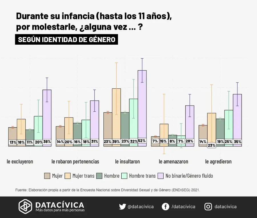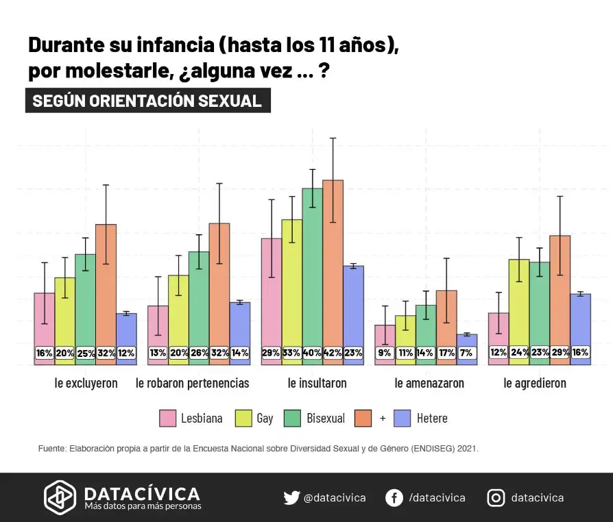 Considerando el mínimo tamaño de la muestra para algunos subgrupos que cruzan la diversidad de género y la diversidad sexual, consideramos que no tenemos elementos para obtener información para grupos como personas trans que no sean heteres. Por eso decidimos ser un poco menos exigentes e intentar entender la violencia que vive la diversidad sexual y la diversidad de género al “salir del closet” y durante su infancia. Esto únicamente realizando comparaciones entre grupos de personas que se identifican con una orientación sexual no normativa o realizar comparaciones entre grupos de personas que se identifican con una identidad de género no normativa.