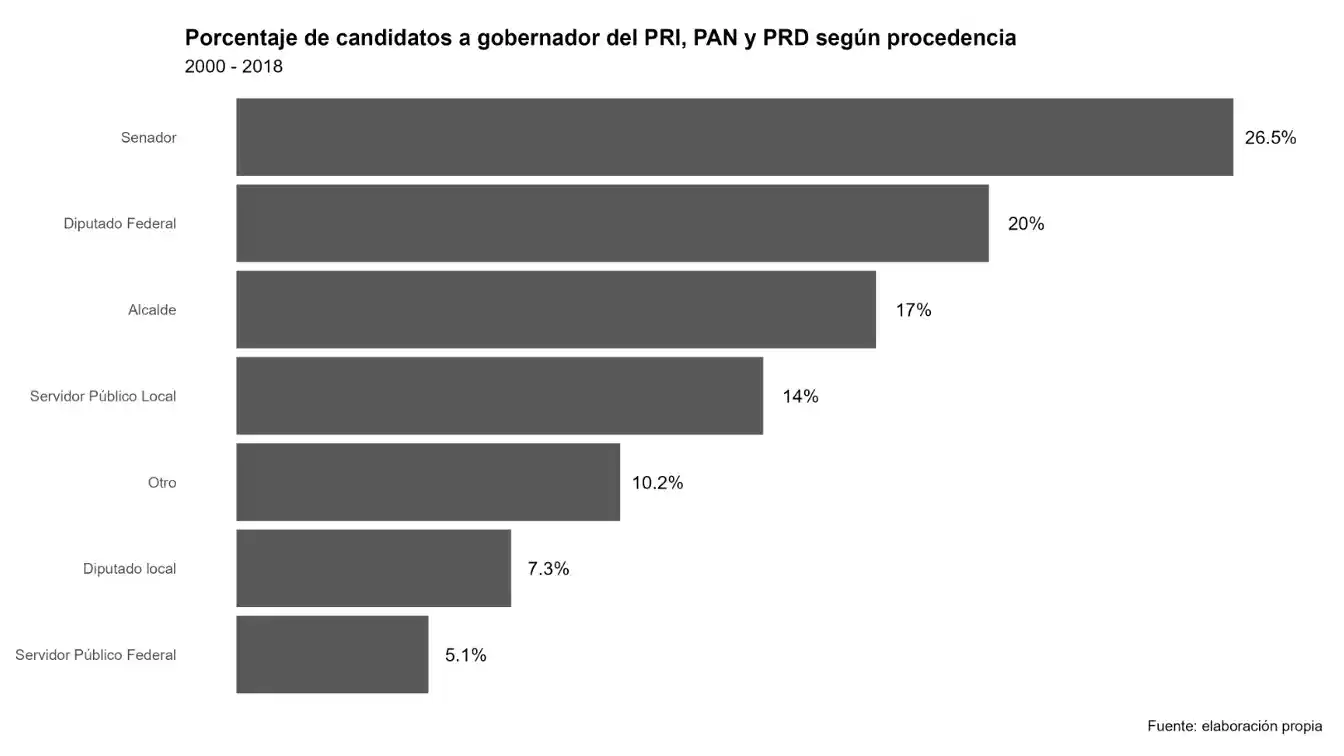 Al mismo tiempo, la procedencia de los aspirantes a obtener una candidatura para gobernador se modificó dramáticamente en el siglo XXI. Ya se dijo que en la etapa de hegemonía priista los funcionarios federales tenían una preeminencia en las candidaturas ejecutivas subnacionales del tricolor. Por el contrario, como se muestra a continuación, entre el año 2000 y el 2018 el 63.5 % de las candidatas y los candidatos a gobernador de los tres partidos más grandes de entonces (PRI, PAN y PRD) venían de ser legisladores federales y alcaldes. Los senadores en concreto tenían una preponderancia en la búsqueda de estas candidaturas al representar el 26.5 % del total, seguidos de los diputados federales y los alcaldes, con 20 % y 17 %, respectivamente.