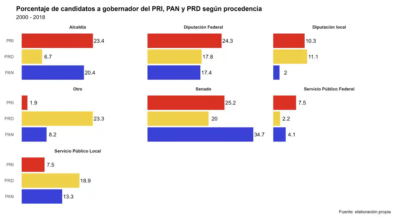 No obstante, al revisar la procedencia de las candidatas y los candidatos que compitieron en elecciones de gobernador durante el periodo de pluralismo competitivo (2000-2018), se puede apreciar que cada fuerza política mantenía particularidades en su patrón de reclutamiento. Mientras que el PRI y el PAN reclutaban candidatos provenientes del Poder Legislativo federal y de alcaldías, el PRD mantuvo un reclutamiento mayoritario de políticos no profesionales, es decir, que no habían ocupado cargos políticos previos. Esto se debe a que durante los primeros tres sexenios presidenciales del siglo XXI el PRI y el PAN fueron partidos consolidados con mayorías legislativas a nivel federal, por lo que contaban con una gran reserva de aspirantes a candidatos a gobernador que fungían como legisladores.