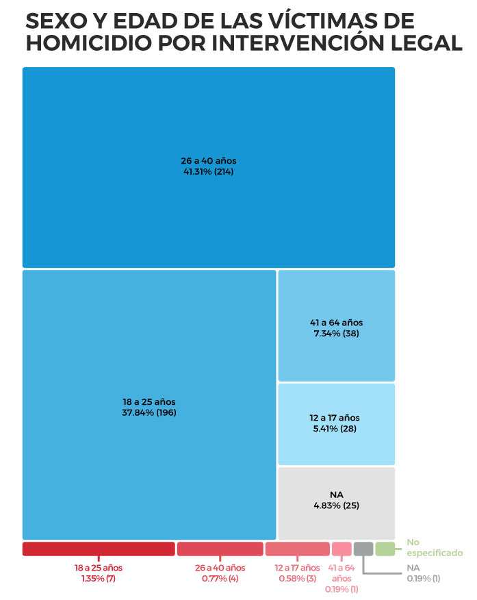 El 96.7% de las personas fallecidas por una intervención legal en México han sido hombres. El 41.3% de ellos tenían entre 26 y 40 años. Los hombres de entre 18 y 25 años, le siguen como el segundo grupo que más ha muerto por esta causa y representan el 37.8% de los casos. Es decir, son hombres jóvenes los que han muerto en mayor medida a manos de la fuerza pública.