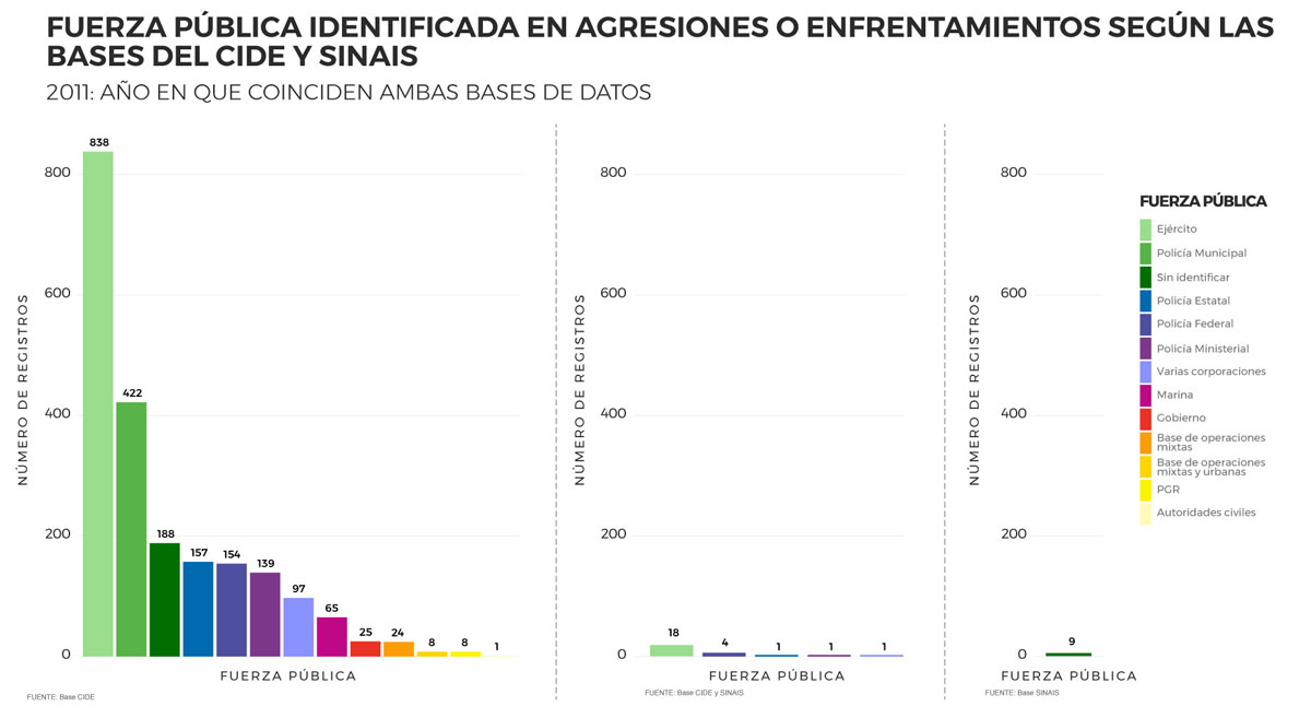 Cuando comparamos SINAIS con la base del CIDE para 2011, el único año en el que ambas fuentes coinciden temporalmente, descubrimos que la primera sólo contenía 2.5% de las víctimas de la segunda. Mientras que el SNSP ni siquiera identifica casos de muertes a manos de autoridades. Es importante recordar que la base de SINAIS se origina por reportes de médicos legistas sobre cuerpos; mientras que la base del CIDE se origina por reportes de las propias autoridades federales involucradas en enfrentamientos; y la base del SNSP se origina de averiguaciones previas / carpetas de investigación de procuradurías estatales.