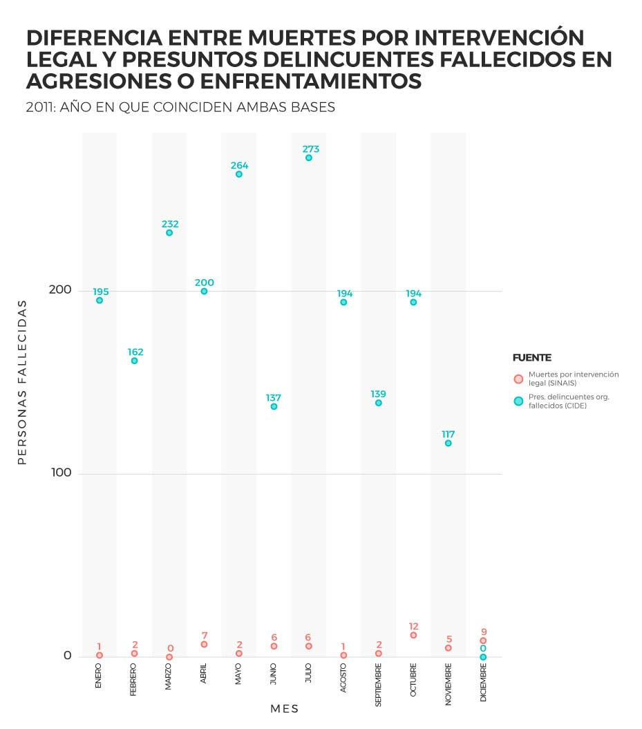 La base del CIDE identifica 2,151 enfrentamientos o agresiones únicamente para el año 2011. Sólo en 25 casos, de todo ese universo, también se registraron muertes por intervención legal en SINAIS el mismo día y en el mismo municipio. Es decir, SINAIS sólo contiene información sobre víctimas de homicidios de 25 de 2,151 registros. Y al dái hoy, SINAIS sobrevive como la única fuente para aproximarnos al problema. Hay además nueve casos más que sólo se encuentran en SINAIS pero que no tienen ningún enfrentamiento o agresión registrada ese día en la base del CIDE. Se trata, quizás, de víctimas de homicidio a manos de autoridades que no ocurrieron durante un enfrentamiento con presuntos miembros del crimen organizado.