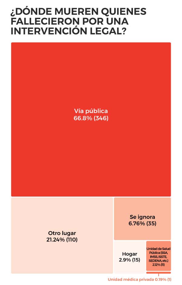 Sólo 3% de todas las muertes por intervención legal han muerto en su casa. La mayoría de las víctimas, 66.8% de ellas han muerto en la vía pública. Sorprendentemente no sabemos donde murieron el 28% de las víctimas, pues no se especifica o simplemente se ignora el lugar donde ocurrió el hecho. A partir de los datos, podemos llegar a pensar que muy pocos lograron atenderse en algún hospital o centro de salud, apenas un 2.12% logró llegar a una unidad de salud pública, mientras que sólo una persona murió en una unidad médica privada.