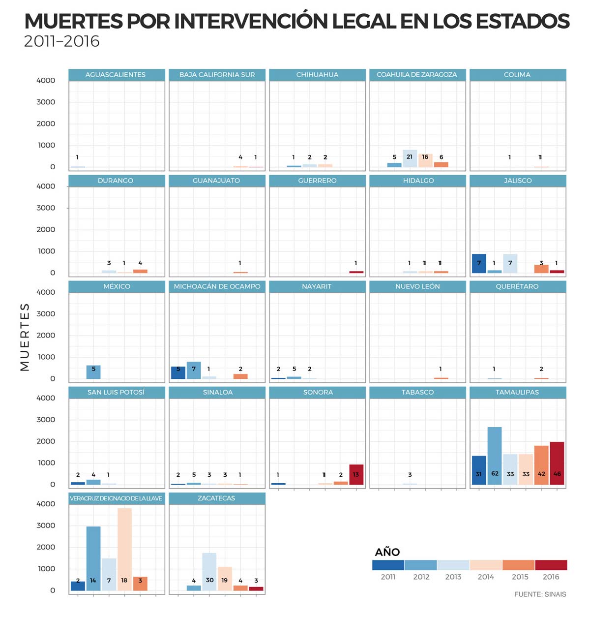 Tamaulipas encabeza la lista de entidades con más casos. De 2011 a 2016, en Tamaulipas han muerto 247 personas a manos de elementos de la fuerza pública. Siendo en 2012 el año cuando se registró el mayor número de casos: 62 muertos. Sinaloa otro de los estados más violentos del país, sólo registró 14 muertos en ese mismo período. Guerrero registró sólo un caso en todo el período. Mientras que Michoacán tuvo 15 fallecimientos por esta causa. En segundo lugar, después de Tamaulipas se encuentra Zacatecas. A comparación de Tamaulipas, en Zacatecas sólo se registraron dos muertos menos, quedando en un total de 60 personas que murieron a manos de la fuerza pública.