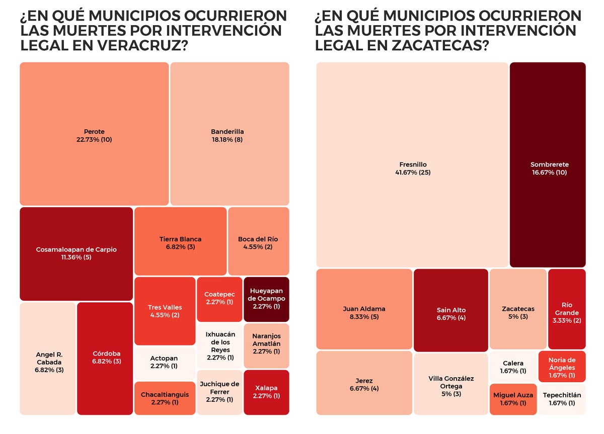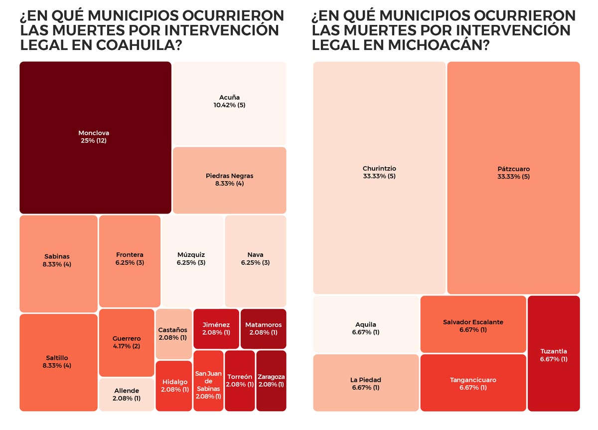 Si analizamos la distribución geográfica dentro de los estados, también podemos observar una concentración de los homicidios por esta causa. En Coahuila el 25% de los casos ocurrieron en el municipio de Monclova. En Michoacán el 66.7% de los homicidios por intervención legal ocurrieron en los municipios de Pátzcuaro y Churintzio. En Sinaloa el 35.7% de los casos tuvieron lugar en Ahome (Los Mochis). En Veracruz 22.7% de los homicidios por intervención legal ocurrieron en el municipio de Perote. En Zacatecas 41.7% de los casos ocurrieron en Fresnillo. Mientras que, en estado con más casos, en Tamaulipas, los casos se concentraron en Reynosa, donde se registraron el 49.4% de los homicidios.