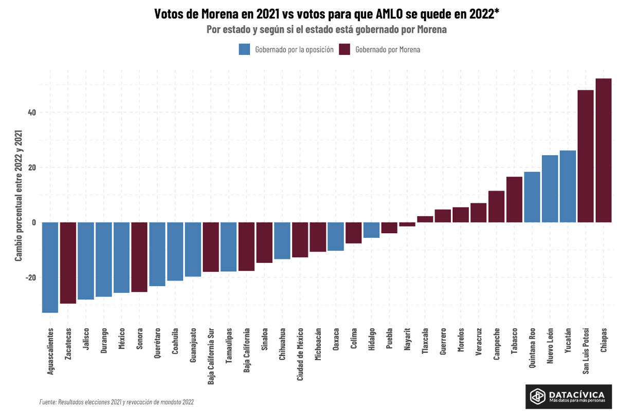 Aun con esto en mente, en Data Cívica decidimos hacer una comparación que consideramos útil, pero imperfecta. Optamos por analizar los datos de la revocación a la luz de los resultados electorales de Morena en la elección intermedia de 2021. Sabemos que la comparación no es ideal, pero que, en teoría, esperaríamos que el apoyo hacia el partido del presidente en 2021 puede servir como una línea base para evaluar el desempeño de Morena y el presidente en la elección de revocación del mandato.