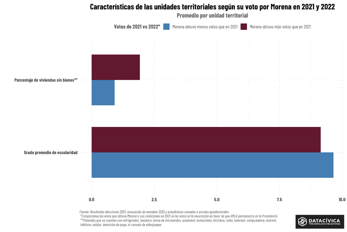 Las unidades territoriales donde a Morena le fue mejor durante la revocación también tienen un año menos de escolaridad promedio que aquellas donde le fue mejor durante las elecciones. Finalmente, el voto más alto en la revocación de mandato también parece estar muy relacionado con pobreza extrema. Aquellas unidades territoriales donde Morena obtuvo un número inusualmente alto de votos por AMLO tienen casi el doble de porcentaje de viviendas que no cuentan con refrigerador, lavadora, horno de microondas, automóvil, motocicleta, bicicleta, radio, televisor, computadora, internet, teléfono, celular, televisión de paga, ni consola de videojuegos.