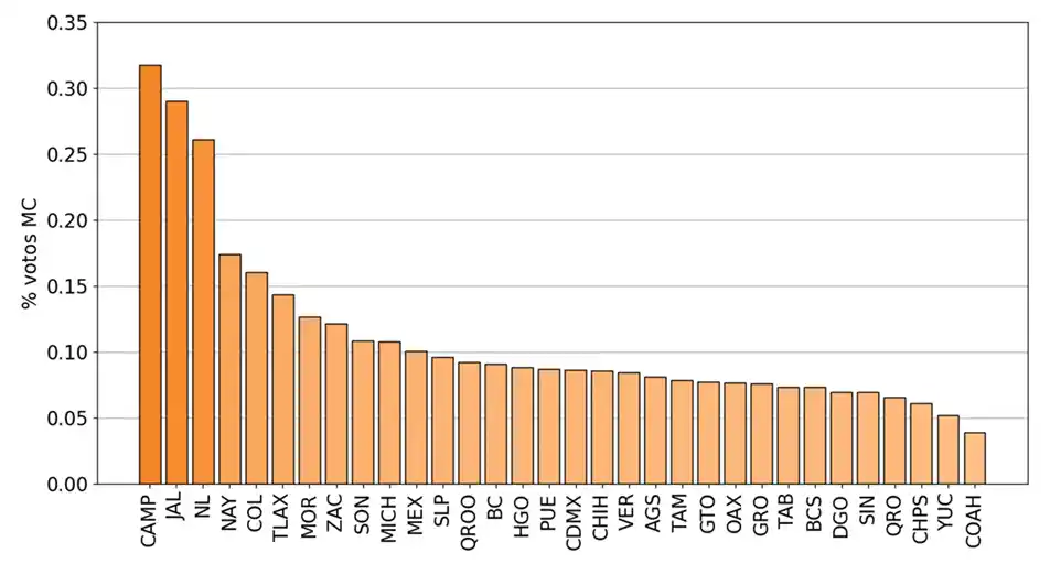 Como se mencionó antes, en las elecciones de 2024 MC recibió el 11.64 % de la votación nacional (válida) emitida para la elección de la Cámara de Diputados. A nivel estatal, sin embargo, los votos obtenidos por este partido se distribuyeron de forma heterogénea. En tres estados, Campeche, Jalisco y Nuevo León, MC logró entre 26 y 32 % de la votación estatal en la categoría antes mencionada. En las 29 entidades federativas restantes su porcentaje osciló entre 4 y 17.