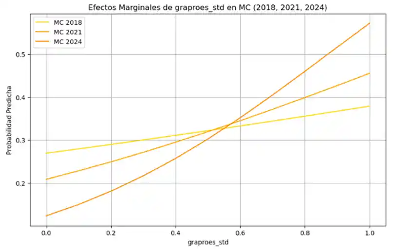 Finalmente, en 2024, la influencia del nivel educativo en el desempeño electoral de MC es aún más pronunciada. La probabilidad de obtener un buen resultado electoral para MC pasó de 12.3 % a 57.24 % con cada aumento en el nivel educativo promedio. A medida que la educación promedio de la población mejora, MC muestra una tendencia creciente en sus buenos resultados electorales.