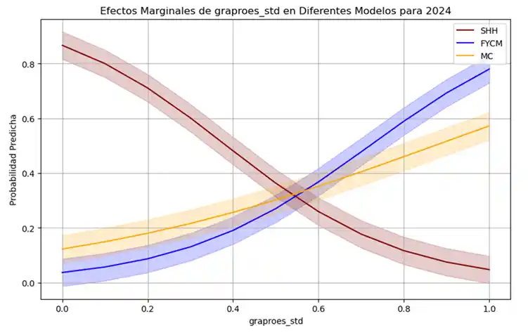 De manera similar, MC muestra una relación positiva entre el nivel educativo promedio y sus resultados electorales en las secciones. Por cada incremento en la magnitud antes dicha, la probabilidad de un buen resultado para MC aumenta en aproximadamente 4.95 %. En resumen, estos resultados indican que, a medida que el nivel educativo promedio de la población aumenta, es más probable que FYCM y MC obtengan mejores resultados electorales, mientras que SHH podría ver una disminución en su apoyo.