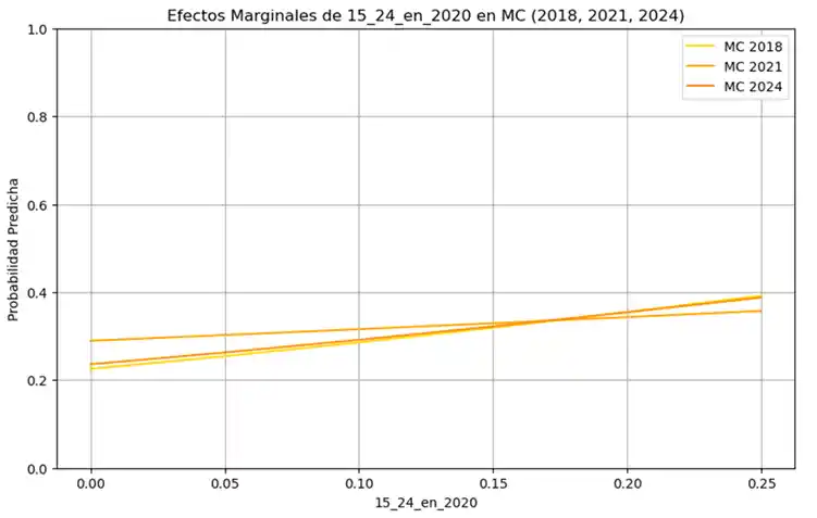 En 2024, con un 0 % de personas jóvenes, la probabilidad de buenos resultados para MC es del 23.59 %. Con un 10 % de personas jóvenes, la probabilidad aumenta al 29.16 %, y con un 20 %, llega al 38.78 %. Si el porcentaje de jóvenes es del 30 %, la probabilidad de buenos resultados para MC es del 42.25 %. La magnitud del cambio en la probabilidad varía entre los años. En 2018 y 2024, el aumento en la probabilidad es más pronunciado comparado con 2021. Esto sugiere que la influencia de la población joven en los resultados electorales de MC puede haber fluctuado a lo largo del tiempo, pero sigue siendo significativa.