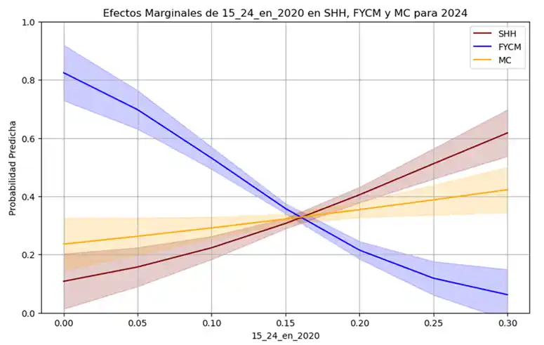 En contraste, la coalición FYCM muestra una relación inversa. A medida que aumenta el porcentaje de jóvenes en una sección, la probabilidad de obtener buenos resultados electorales en ese enclave disminuye. Con cada incremento del 10 % en la proporción de este grupo etario, la probabilidad de un buen resultado para FYCM disminuye en 28.4 puntos porcentuales. El partido MC, similar a SHH, se beneficia de un mayor porcentaje de personas jóvenes en las secciones electorales. Por cada incremento del 10 % en la proporción de personas jóvenes, la probabilidad de un buen resultado electoral para MC aumenta en 5.4 puntos porcentuales. Aunque el impacto no es tan fuerte como en el caso de SHH, sigue siendo positivo y estadísticamente relevante. En la siguiente gráfica se incluyen los efectos marginales de las variables ya explicadas.