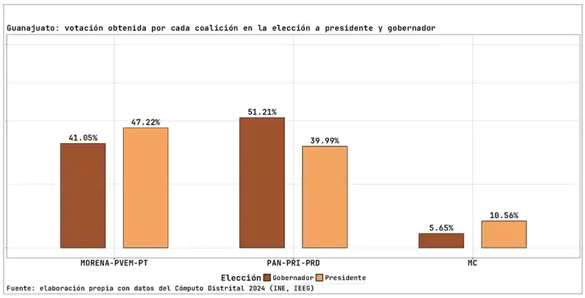 Para tener una primera aproximación al voto diferenciado, analizamos el caso de Guanajuato y los resultados entre presidente y gobernador. Nos concentramos en este estado por dos razones. La primera porque, como lo mencionamos al inicio, el PAN ha logrado mantener el poder en Guanajuato durante casi 30 años. La segunda razón es porque, a diferencia de Jalisco, en Guanajuato compitieron las mismas coaliciones para presidente y gobernador, lo que permite una mejor comparativa entre cargos diferentes.