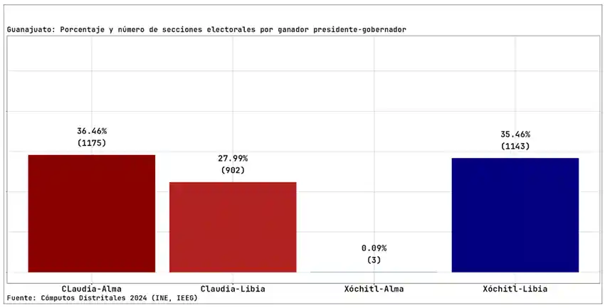 Que Xóchitl Gálvez y Alma Alcaraz fueran poco competitivas en Guanajuato pudo deberse a que los votantes de ambas estimaran como poco probable su triunfo (voto útil), que algunos votantes en Guanajuato prefirieran las propuestas de Libia para el estado y las de Claudia para todo el país o que, mucho más sofisticados, los votantes decidieron equilibrar los poderes entre gobernadora y presidenta.