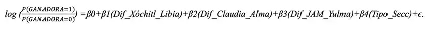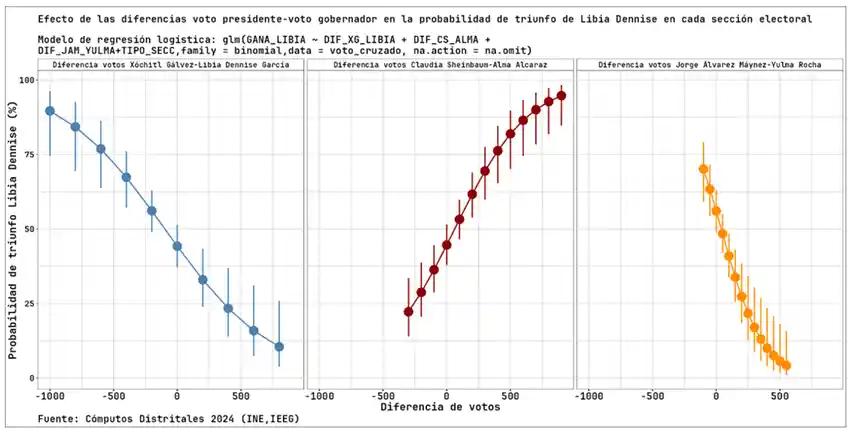 Para medir el efecto del voto cruzado sobre el triunfo de una candidata a gobernadora, calculamos la diferencia entre las votaciones presidenciales y de gobernador sobre el triunfo de las principales candidatas, Libia Dennise García y Alma Alcaraz, por sección electoral. Sobre estas diferencias ajustamos un modelo de regresión logística donde la variable dependiente es una variable dicotómica con valor 1 si una candidata ganó en una sección electoral y 0 si la candidata perdió.