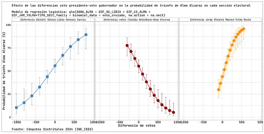 Los modelos ajustados indican que, a menor voto para Xóchitl Gálvez y menor voto para Alma Alcaraz, la probabilidad de voto cruzado aumenta. Dicho de otra forma, estas dos candidatas no lograron capturar la ventaja que sus compañeras de coalición mantuvieron a lo largo de la campaña, siendo el efecto de voto diferenciado más evidente entre los votantes de Libia Dennisse que votaron a Claudia Sheinbaum, pues es donde se concentra en mayor número de secciones con voto cruzado.
