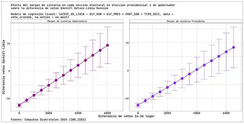 Gráfica 5. Efecto de los márgenes de victoria sobre las diferencias de voto Xóchitl Gálvez-Libia Dennise