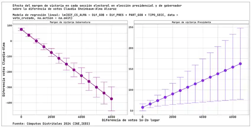 Gráfica 6. Efecto de los márgenes de victoria sobre las diferencias de voto Claudia Sheinbaum-Alma Alcaraz