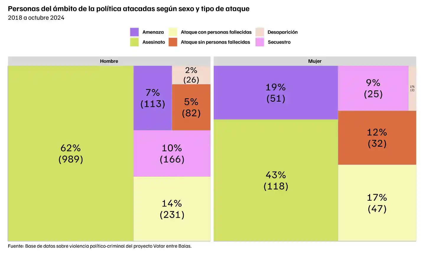 Visto de otra manera, del total de mujeres registradas como atacadas en la base de datos de Votar entre Balas, el 19 % fue víctima de amenaza, en los hombres sólo el 7 % de los registrados como atacados fueron amenazas, una diferencia de 12 puntos porcentuales. Además, un mayor porcentaje de mujeres ha vivido ataques armados en donde no hubo personas fallecidas en comparación con los hombres (12 % vs. 5 %). Es decir, el 31 % de las mujeres víctimas de violencia político-criminal ha experimentado ataques no letales, mientras que sólo 12 % de los hombres atacados lo experimentaron (amenazas más ataques en donde no hubo personas fallecidas).