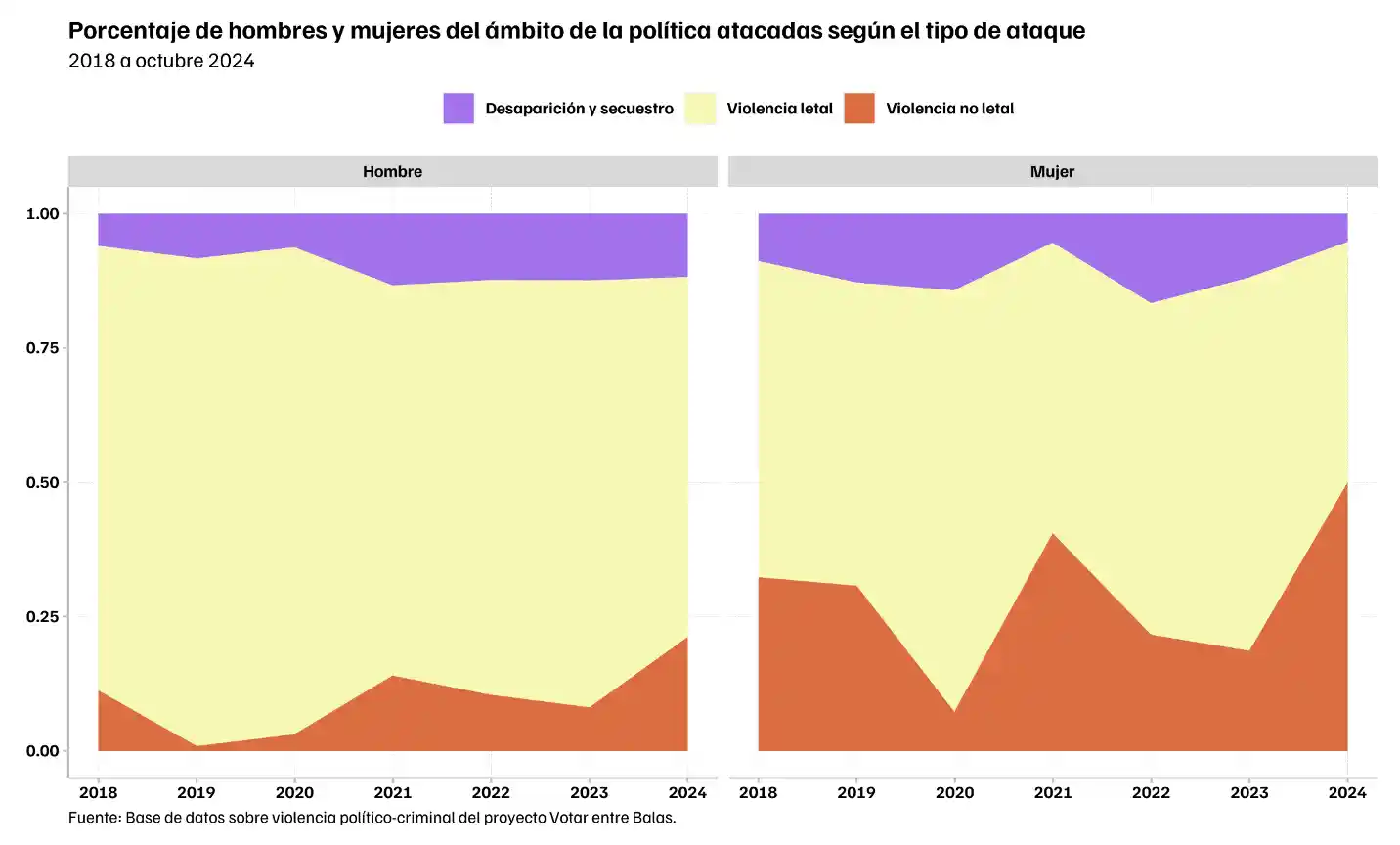 Además hemos encontrado que las mujeres en la política han experimentado durante todo el periodo para el que tenemos registro más ataques no letales por parte de grupos de la delincuencia organizada en comparación con los hombres, como se muestra en la gráfica de abajo. Del total de hombres registrados como atacados en 2024, el 67 % sufrió ataques letales, 12 % sufrió secuestros o desapariciones y 21 % ataques no letales; mientras que del total de mujeres registradas como atacadas en 2024, el 45 % sufrió ataques letales, 5 % sufrió secuestros o desapariciones y 50 % ataques no letales.