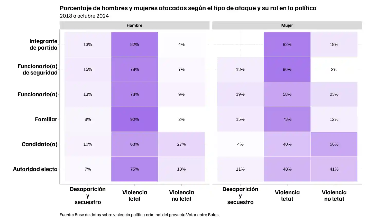 Votar entre Balas es un proyecto que registra sobre todo violencia física extrema en contra de personas de la política (y un tipo de violencia psicológica, las amenazas) por parte de un actor específico: grupos de la delincuencia organizada. No obstante, las mujeres en política experimentan violencia por parte de diversos actores (integrantes de partidos políticos, votantes, familiares, parejas, seguridad estatal, funcionarios, etc.), además de ser víctimas de distintas expresiones de violencia.