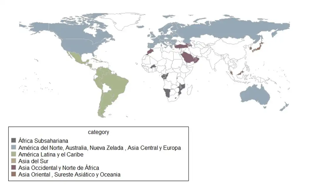 Figura 1. Países con datos administrativos disponibles para parto prematuro, según región. Cada color representa una región. Las regiones fueron clasificadas según seis categorías de los Objetivos de Desarrollo Sostenible.