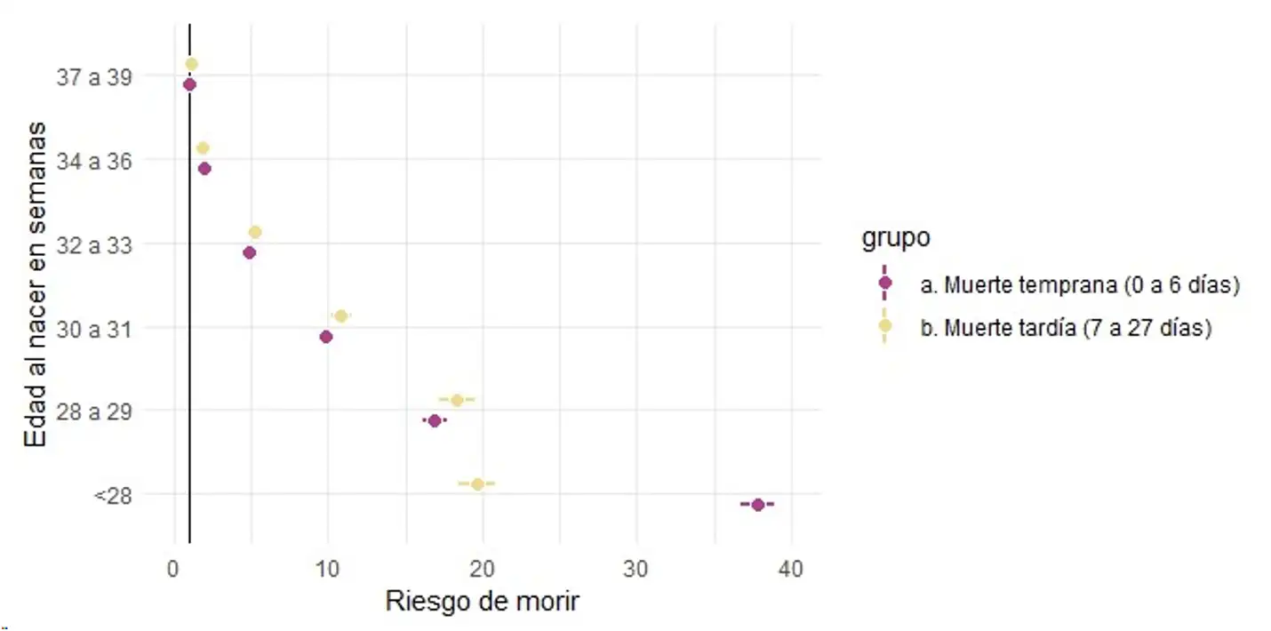 Además, existe un gradiente de riesgo según la edad gestacional. Por ejemplo, las personas nacidas en las semanas 28 a 29 tuvieron un riesgo de morir de 20 veces durante el periodo neonatal, en comparación con el grupo control. Este riesgo se redujo a 10 veces en las semanas 30 a 31 y alrededor de 5 veces ntre las semanas 32 a 33 de gestación.