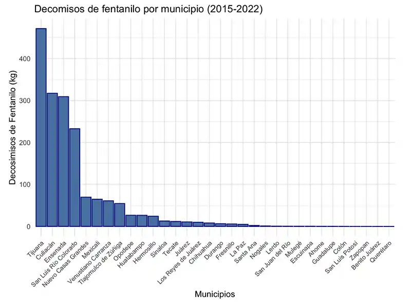 En las siguientes gráficas, identifiqué los decomisos por estado y municipio entre 2015 y 2022, ordenándolos de mayor a menor. Como se puede apreciar, sí existe cierta verdad en la hipótesis del gobierno. Los tres estados más afectados (Baja California, Sinaloa y Sonora) están en la costa más cercana de China y, a su vez, en las inmediaciones de Estados Unidos. Lo mismo con los municipios más afectados (Tijuana, Culiacán y Ensenada), todos a escasas horas de la frontera y en la costa oeste (si bien es más el caso para Tijuana y Ensenada, Culiacán sigue siendo parte del norte del país).