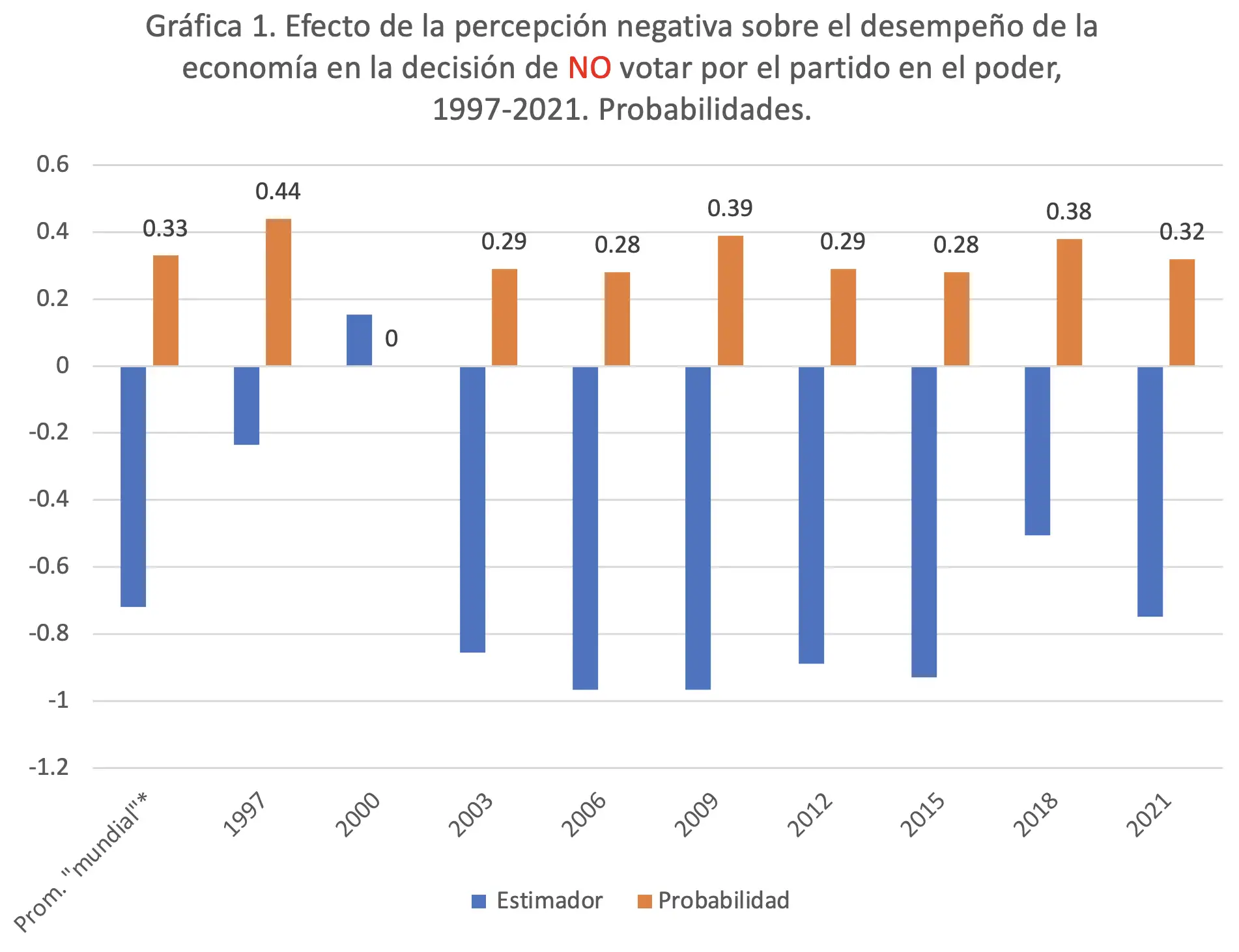 Con base en los estimadores obtenidos en los modelos, estimé la probabilidad esperada de que la persona vote por el partido en el poder si piensa que la economía empeoró en el último año. En el Cuadro 1 y la Gráfica 1 presento los resultados de los modelos correspondientes a cada elección federal entre 1997 y 2021, sólo para la variable que mide la percepción económica del año anterior. Los resultados completos de los modelos se encuentran en el Anexo 1. Con base en los estimadores de los modelos de regresión de cada elección, estime la probabilidad esperada de que un votante no vote por el partido en el gobierno si piensa que la situación de la economía empeoró en los últimos doce meses. Para poder tener una referencia digamos genérica, estime el mismo modelo para 67 elecciones celebradas en por lo menos 35 países entre 1997 y 2018, lo que denomino el “promedio mundial”.
