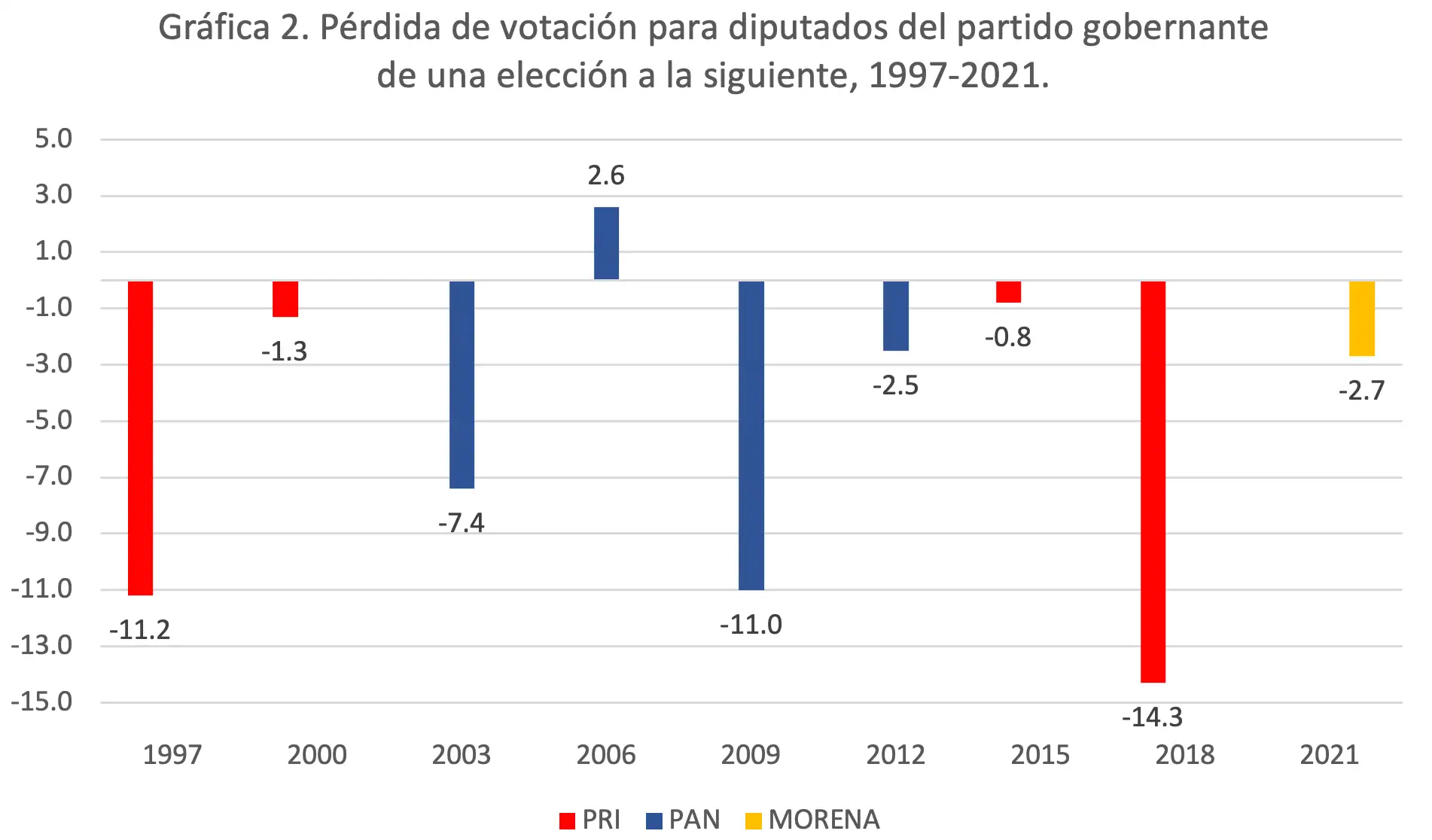 En la Gráfica 2 se presenta el cambio en las preferencias por el partido en el poder en las elecciones para diputado de una elección a la siguiente abarcando desde 1994 hasta 2021. Como se puede apreciar, los mayores cambios se dieron en las elecciones de 1997 y 2018, en detrimento de los gobiernos de Ernesto Zedillo y Enrique Peña Nieto y, en 2009, en contra del gobierno de Felipe Calderón. En 2009, el PAN perdió once puntos en la votación para diputados con respecto a la elección anterior, la misma proporción que perdió el PRI en la elección intermedia de 1997. Otro voto de castigo equivalente que se repite en 2018.