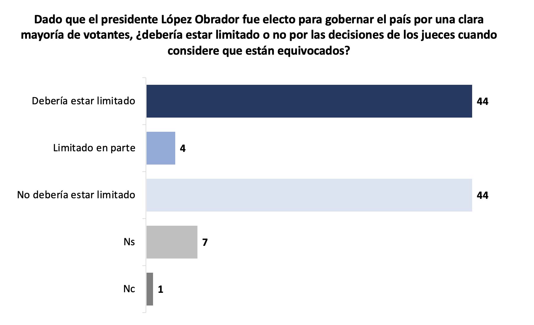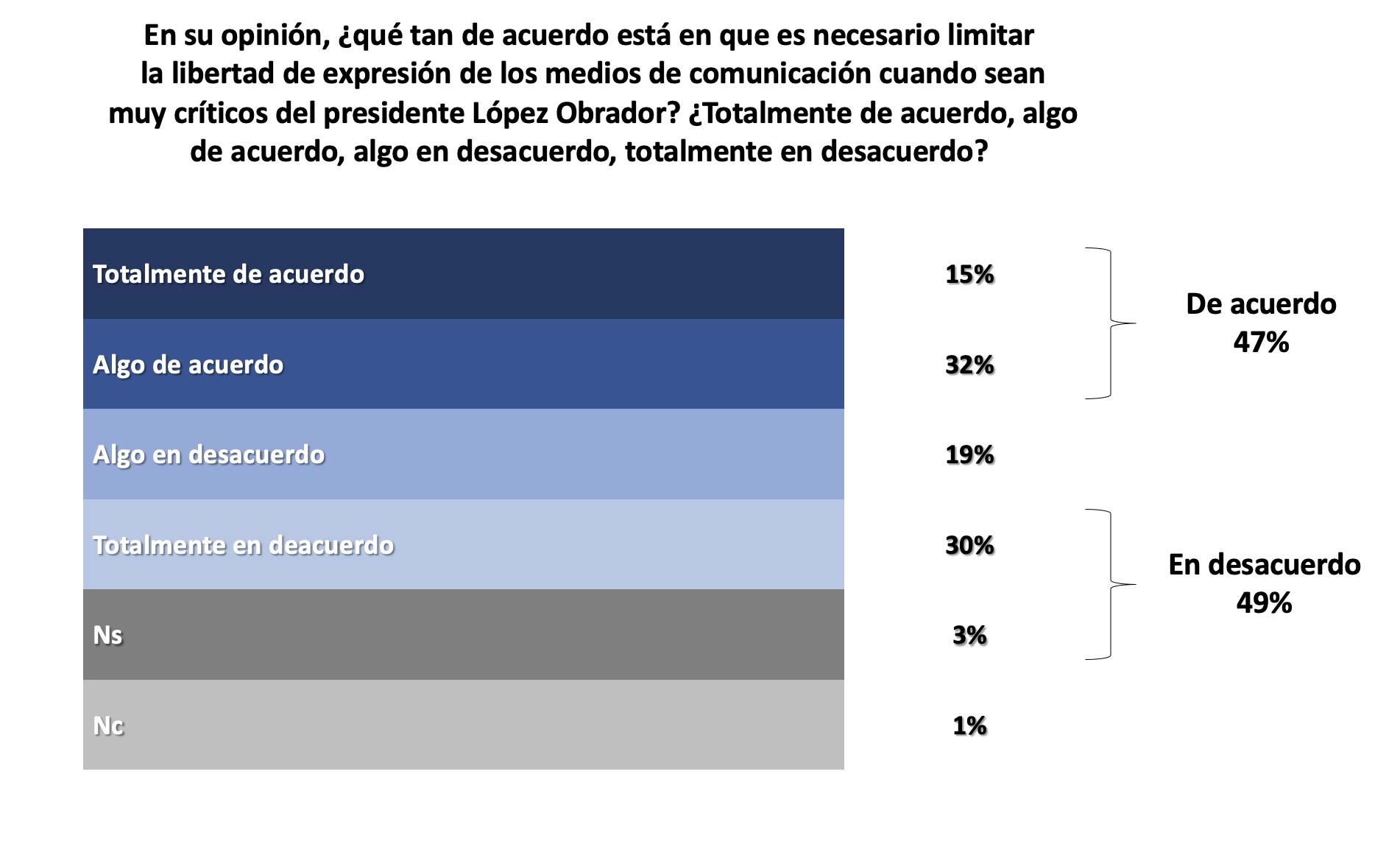 La Encuesta Nacional Electoral de 2021 también incluyó dos preguntas adicionales que miden las actitudes democráticas de la opinión pública, aunque en temas relacionados con la libertad de expresión y los contrapesos en un sistema democrático. Como se observa en las Gráficas 3 y 4, 44 % de la opinión pública en México considera que el presidente Andrés Manuel López Obrador no debería estar limitado por los jueces, y 47 % de la opinión pública en México está de acuerdo con que los medios de comunicación deben ser limitados cuando sean muy críticos del presidente. Estos datos muestran que hay una porción de la opinión pública en México que expresa acuerdo con medidas iliberales que no son consistentes con normas democráticas.