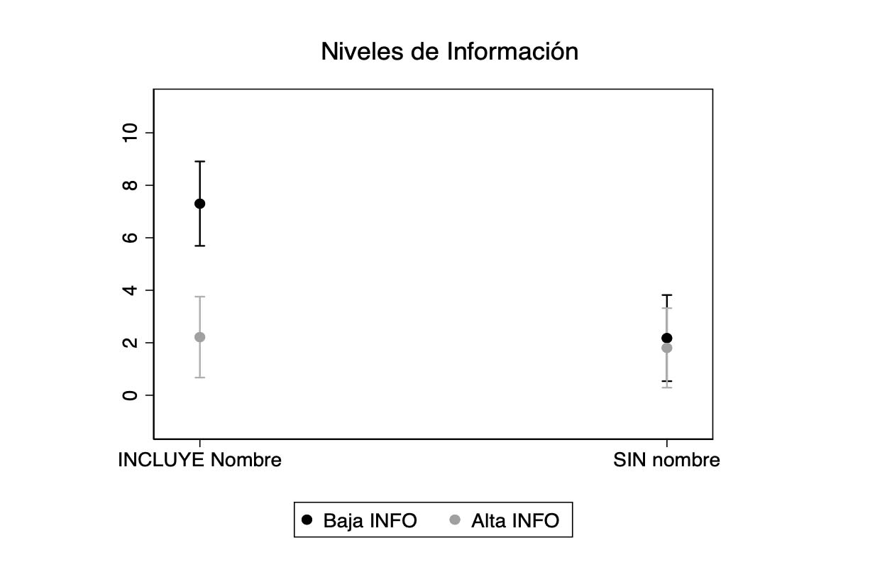 Una vez que se ha confirmado que la identidad partidista efectivamente genera incentivos para justificar en mayor medida una acción iliberal de un gobernante del mismo partido, a continuación se identificaron si hay votantes de Morena que justifican más el hipotético cierre del Congreso: votantes de Morena con alta identidad partidista, con alto nivel de polarización y diferentes niveles de información política (sólo se reportan en este texto los resultados por información política).13 Únicamente se observa una diferencia significativa en el caso de los niveles de información política (ver Gráfica 6). Los votantes de Morena con altos niveles de información política no justifican para nada que se cierre el Congreso, tanto cuando se menciona explícitamente a López Obrador como cuando no se le menciona. Sin embargo, entre votantes de Morena con bajos niveles de información sí hay una diferencia muy sustantiva: cuando no se menciona a López Obrador, no se justifica que se cierre el Congreso (2.2 en la escala 0 a 10), pero cuando sí se menciona explícitamente a López Obrador como quien gobernaría sin el Congreso, aumenta sustantivamente la justificación del cierre del Congreso, un 7.3 en la escala 0 a 10.
