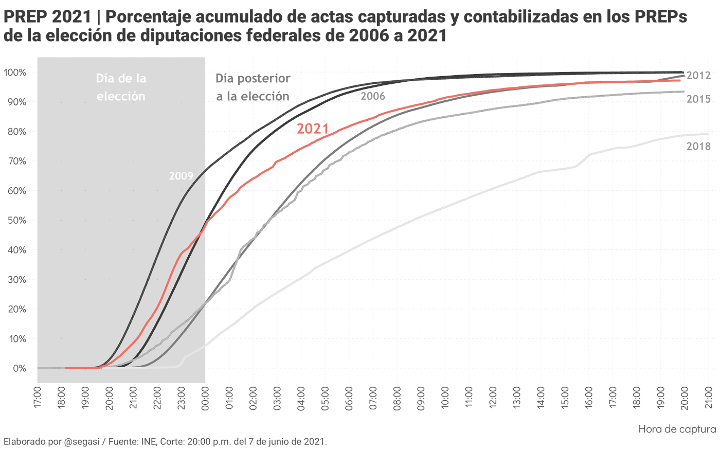 La gráfica muestra que el desempeño del PREP 2021 fue mejor que el de las dos últimas elecciones, y ligeramente peor que en las elecciones de 2006, 2009 y 2012. En 2021 el PREP logró capturar y contabilizar aproximadamente 2 % menos actas que los de estas otras tres elecciones.