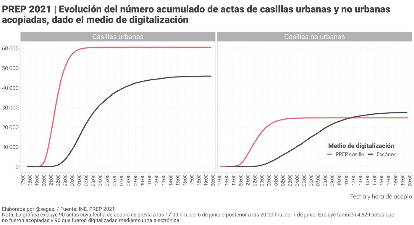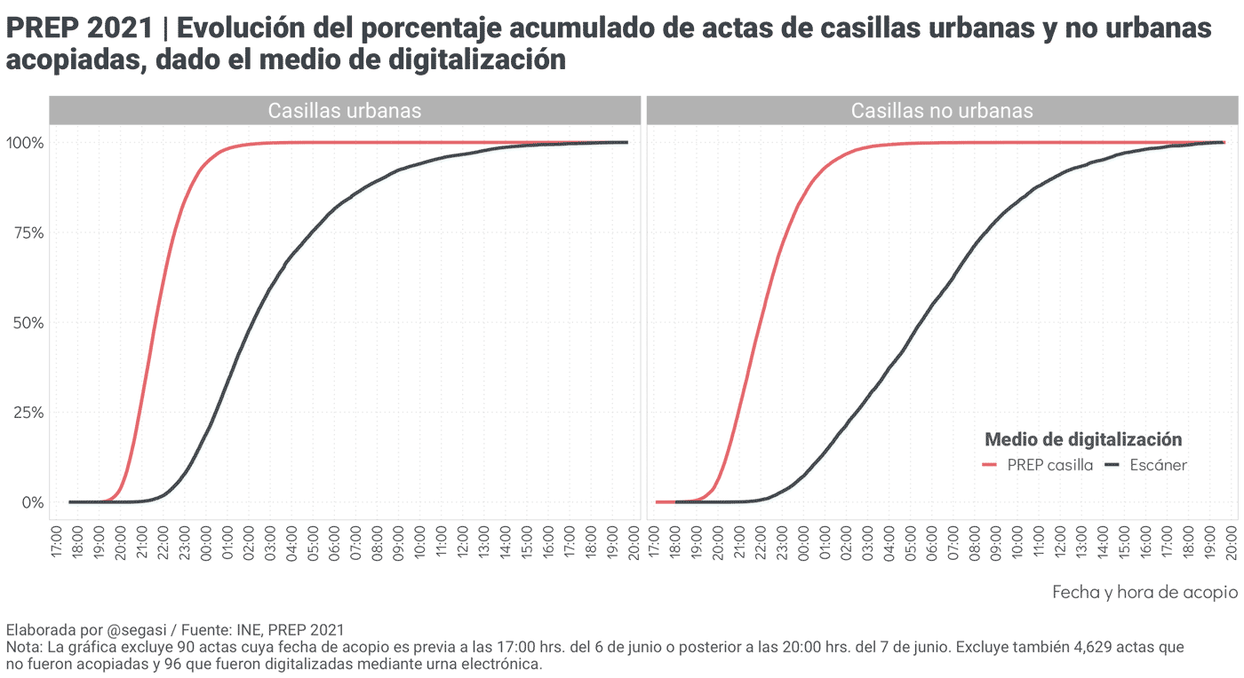 En contraste, el rezago de la curva azul en el caso de las casillas no urbanas es más pronunciado. Mientras que el 75 % de las actas de casillas urbanas digitalizadas mediante escáner fueron acopiadas a las 5 a.m. del 7 de junio, en las casillas no urbanas este porcentaje se alcanzó a las 8:30 a. m. del mismo día.