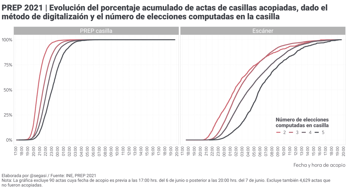 La gráfica revela que, sin importar el número de elecciones computadas en cada casilla,5 todas las actas digitalizadas a través de PREP casilla fueron acopiadas mucho más rápido que las digitalizadas a través de escáner. Por ejemplo, mientras que para la medianoche del 6 de junio se había acopiado el 75 % de las actas digitalizadas con PREP casilla provenientes de estados con cinco elecciones, esta cifra se alcanzó a las 9:00 a.m. del día siguiente para las actas digitalizadas con escáner.