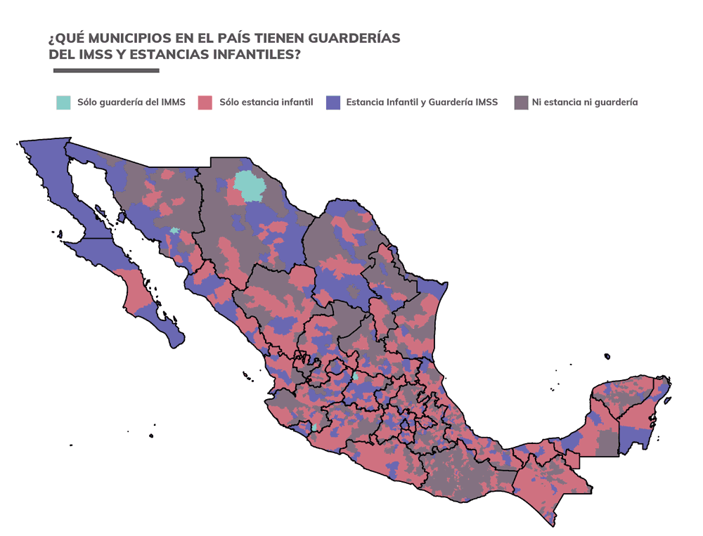 La reducción del presupuesto que la actual administración ha planteado para el programa de estancias infantiles dejará sin apoyo a cerca de 2000 localidades y 300 municipios donde las estancias infantiles son la única alternativa con subsidio gubernamental para el cuidado de niños pequeños. Estos localidades y municipios son también más pobres que aquellos que cuentan con guarderías IMSS, lo que a su vez significa que en estos las mujeres realizan más trabajo de cuidados y se encuentran más vulnerables.