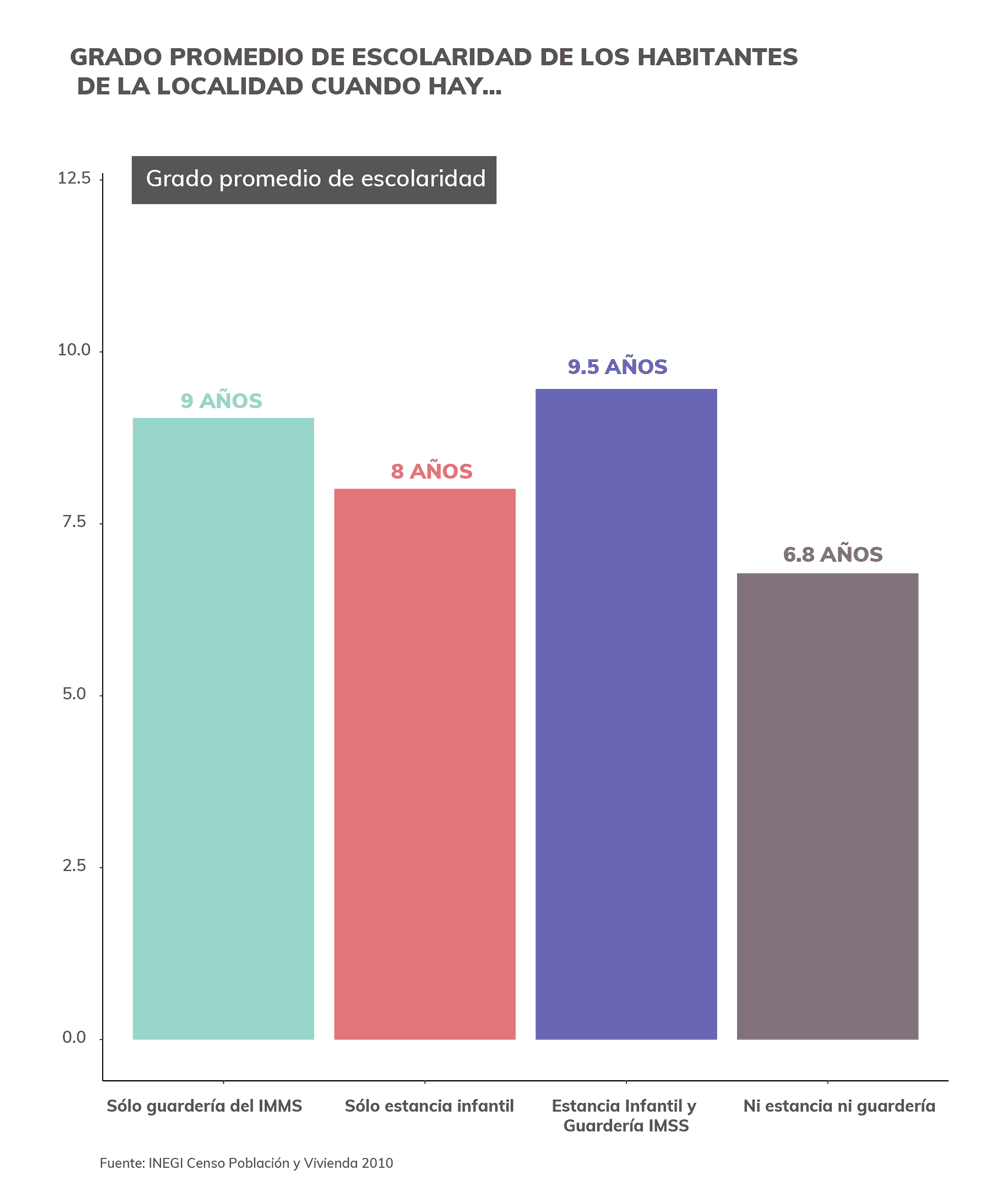 En aquellas localidades donde sólo hay estancias infantiles, la población tiene un grado de escolaridad promedio un año menor que donde hay guarderías del IMSS. Si bien las localidades con nivel de escolaridad más bajo son aquellas donde no hay ni estancias infantiles ni guarderías del IMSS, aquellas donde sólo hay estancias infantiles, que son las que quedarán desprotegidas, tienen el segundo nivel de escolaridad más bajo.