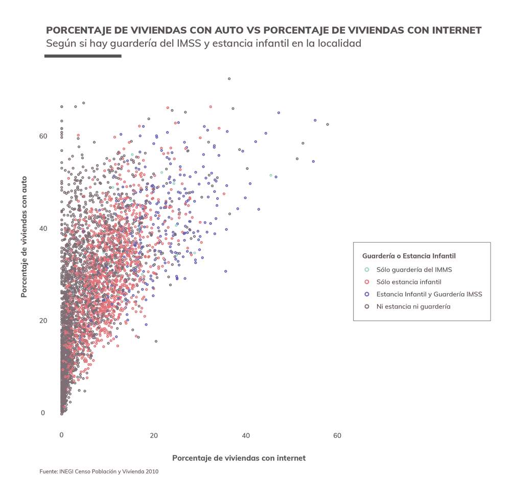 Lo mismo sucede cuando comparamos a las localidades utilizando el porcentaje de viviendas que cuentan con automóvil o internet. Mientras en las localidades que cuentan con guarderías del IMSS, alrededor del 40% de las viviendas cuentan con automóvil, en aquellas donde sólo hay estancias infantiles sólo el 30% tienen uno. Lo mismo sucede con el internet; en aquellas localidades donde sólo hay estancias infantiles, el porcentaje de viviendas con internet es más o menos la mitad del porcentaje que tiene internet en las localidades donde hay guarderías del IMSS.