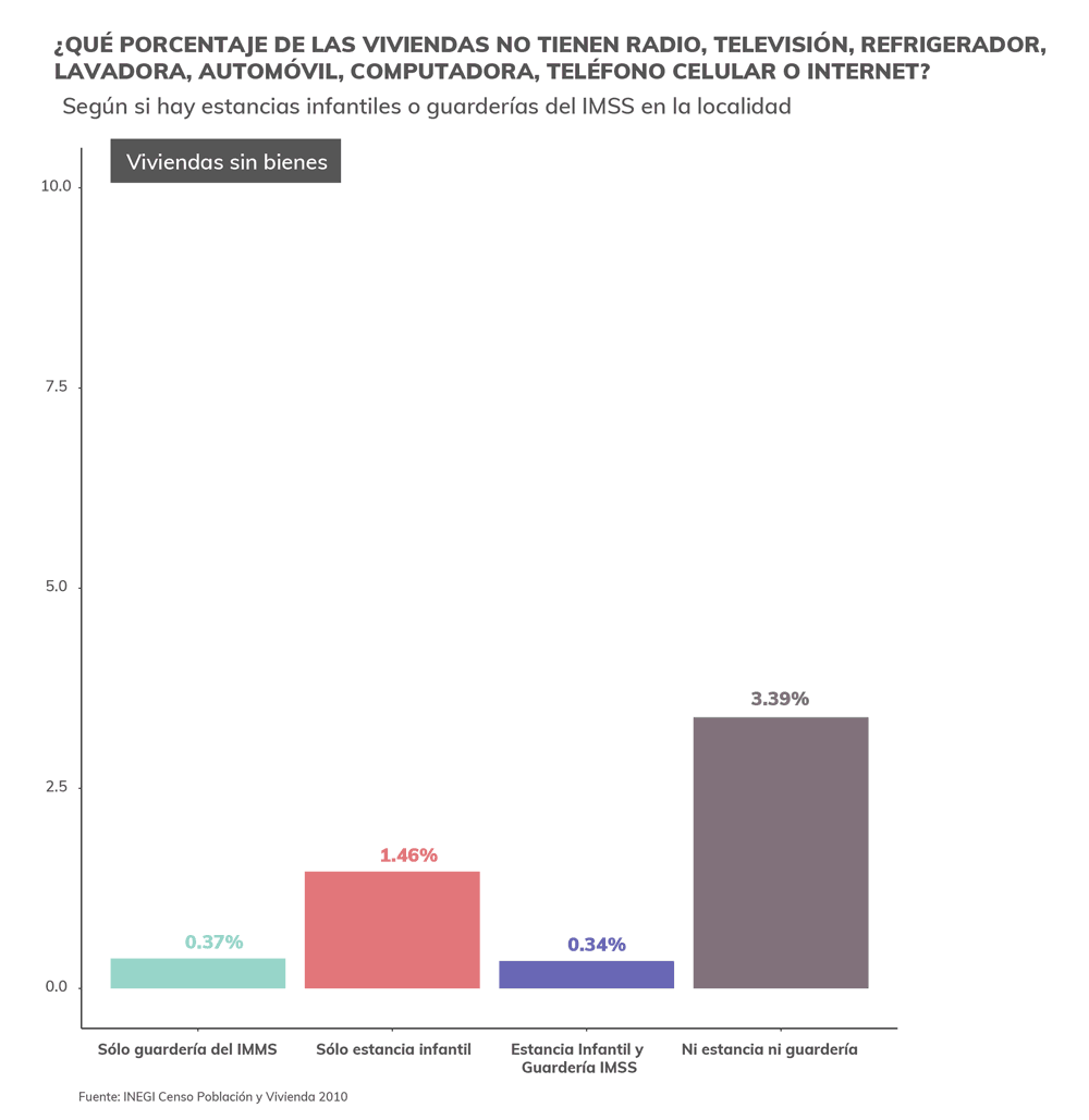 Asimismo, si utilizamos un proxy de pobreza que es la variable del INEGI en la que se clasifican a las viviendas que no cuentan con radio, ni televisión, ni lavadora, ni automóvil, ni computadora, ni teléfono fijo, ni celular, ni internet, podemos ver que en aquellas localidades en las que sólo hay estancias infantiles hay un porcentaje de viviendas pobres que triplica el que existe en aquellas localidades en las que sólo hay guarderías del IMSS. En aquellas localidades donde no hay ni estancias ni guarderías, el porcentaje de viviendas pobres es diez veces mayor que en las localidades que cuentan con guarderías del IMSS.