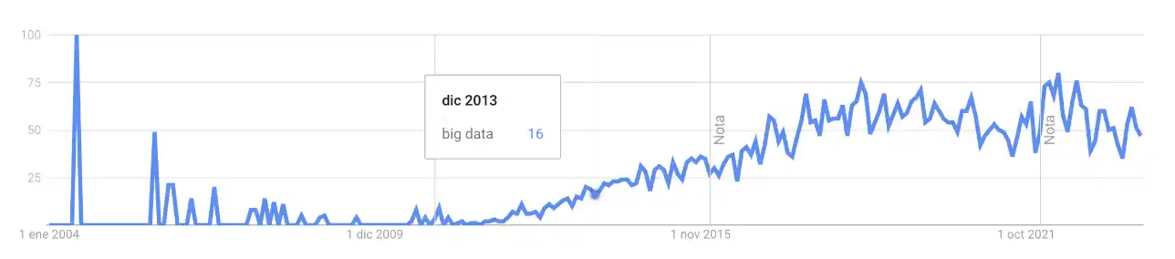 Figura 2: Búsquedas del término “big data” en Google Trends de México desde el año 2004. Se observa que el aumento principal de búsquedas ocurrió a finales de 2013 y desde 2016 se mantuvo en cierto intervalo sin otro aumento tan evidente.
