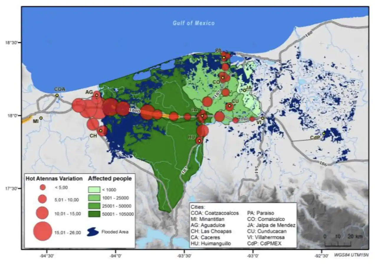 Para analizar el impacto de las inundaciones en Tabasco se utilizaron, entre otras fuentes, datos de teléfonos móviles, ubicación de antenas telefónicas, imágenes satelitales, información sobre el nivel de precipitación pluvial, el Censo de Población del Inegi e información sobre protección civil (que contenía datos sobre la ubicación de albergues).