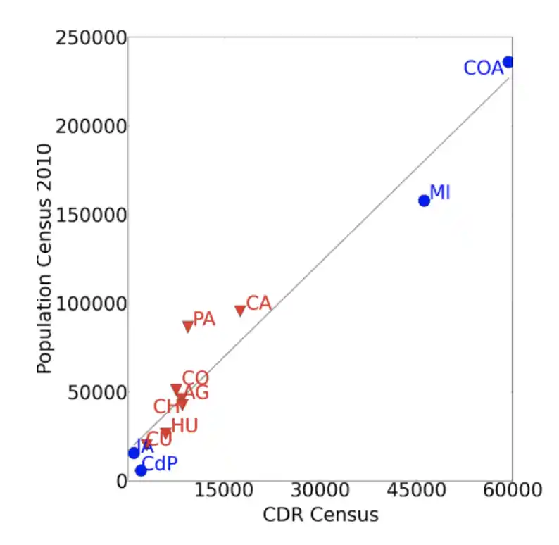 Figura 6: Comparación entre el número de habitantes por municipio según el Censo oficial y el número de usuarios de la compañía de telefonía móvil. La alta asociación lineal entre ambas variables se establece por una R-cuadrada de 0.97.