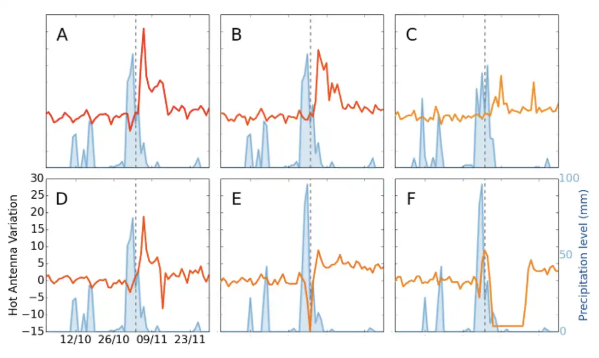 Figura 7: Gráficas que indican el nivel de variación en los patrones de actividad telefónica en seis antenas. El área en color azul representa el nivel de precipitación pluvial y las líneas rojas representan la variación en los patrones de actividad telefónica.
