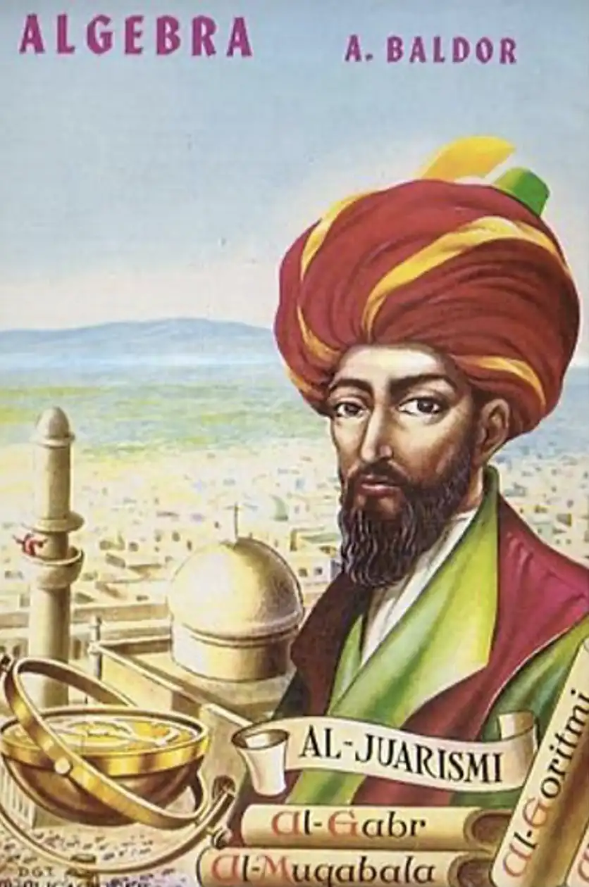 La portada de esta obra muestra una serie de libros en el costado derecho, uno de estos tiene escrito el nombre Al-Goritmi y justo al lado aparece el nombre Al-Juarismi: uno de los matemáticos más importantes de la historia que realizó grandes aportaciones en el álgebra y ayudó a popularizar los números arábigos. Justamente, la palabra algoritmo tiene su origen en la versión latinizada del nombre de este matemático persa que vivió en una época en donde, por supuesto, no existía ChatGPT, ni computadoras, ni grandes cantidades de datos.