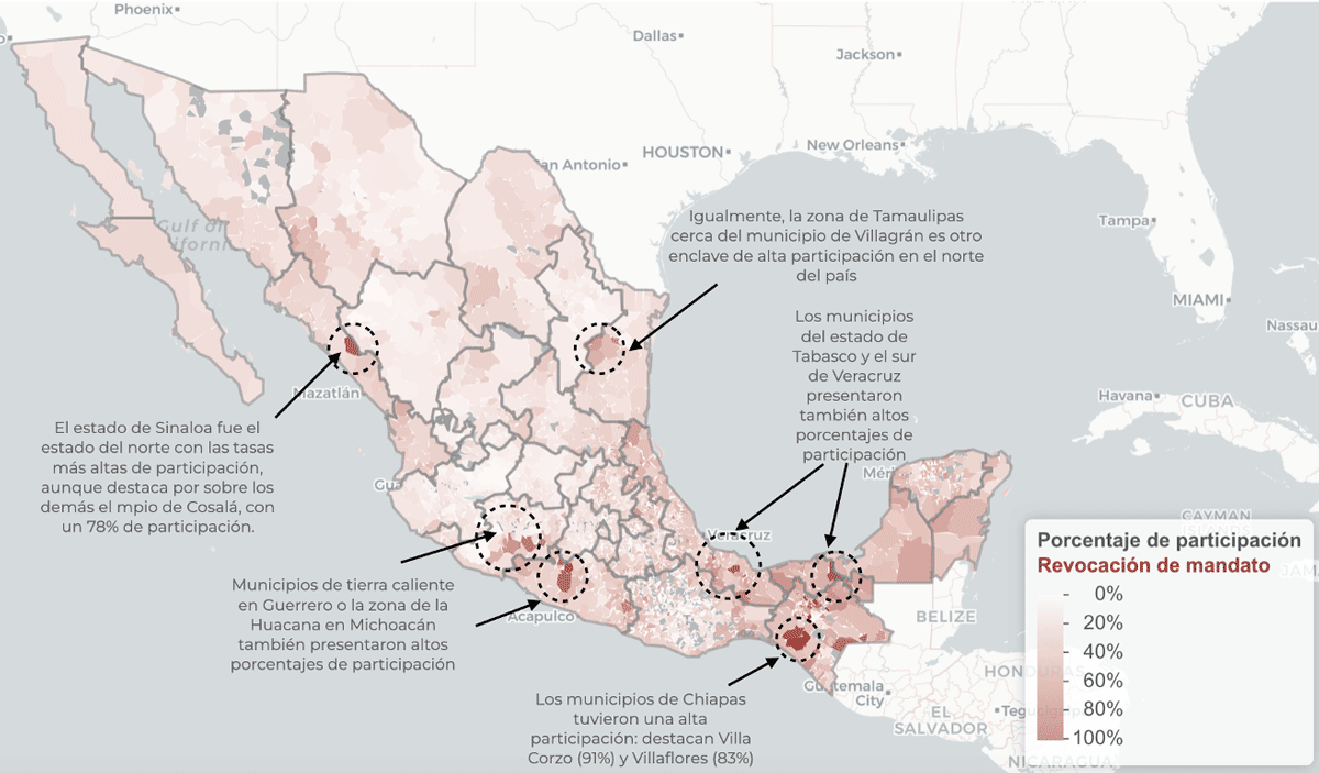 A nivel municipal la consulta tuvo porcentajes de participación más variables. Si visualizamos todos los municipios de México en un mapa, podemos ver que destacan por su alta participación los municipios de Chiapas, Tabasco, Veracruz y ciertas zonas del estado de Guerrero, Sinaloa o Tamaulipas.