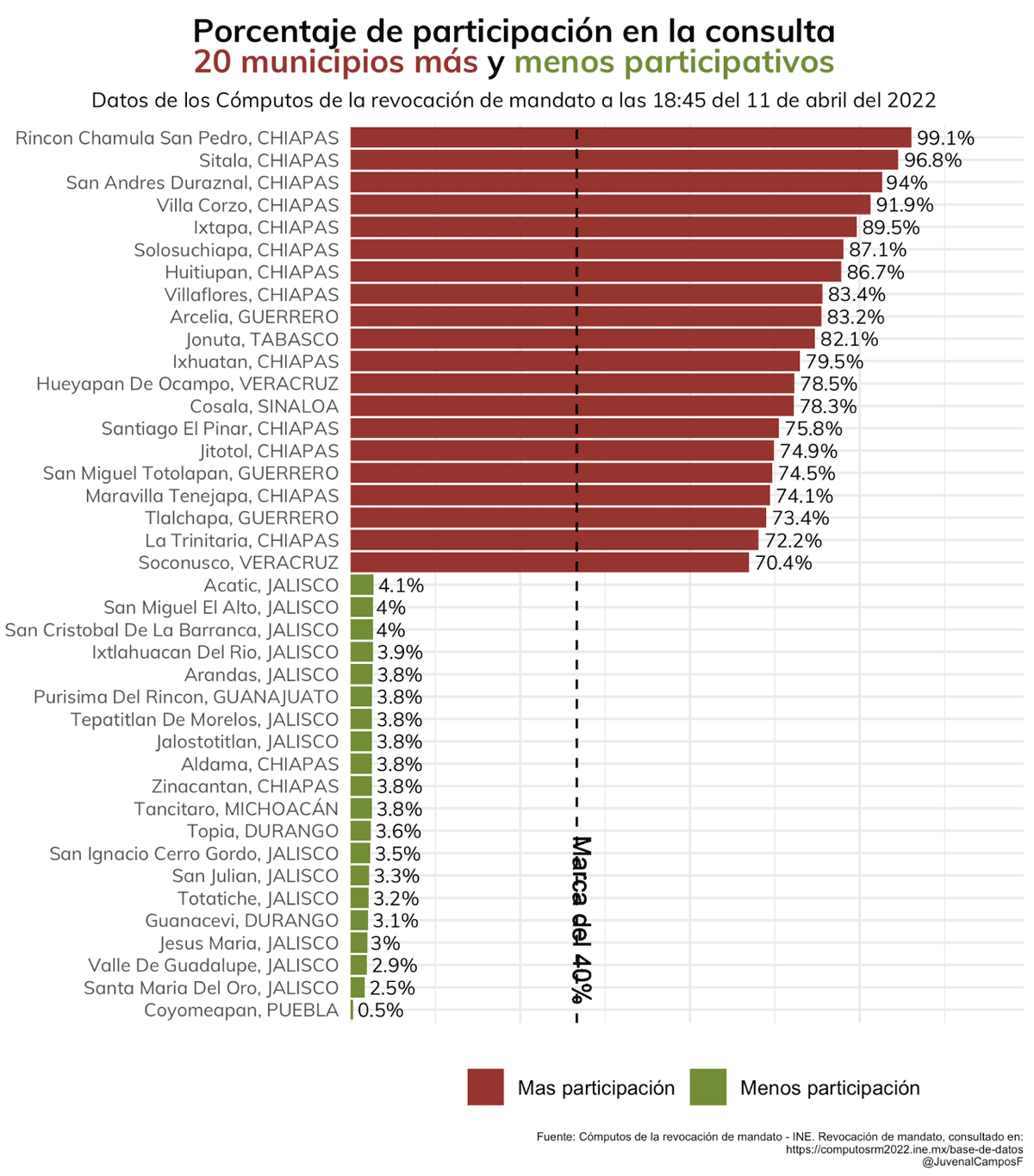 Ahora, si analizamos a los 20 municipios con mayor y menor participación en el proceso de revocación, podemos observar que, en varios de los municipios de Chiapas se llegan a alcanzar porcentajes de participación de más del 90 %, un fenómeno bastante curioso y digno de estudiarse de manera detallada. Igualmente, son curiosas las bajas tasas de participación de municipios en estados como Guanajuato o Jalisco, donde menos de una persona de cada 100 se molestó en participar en el proceso de revocación.