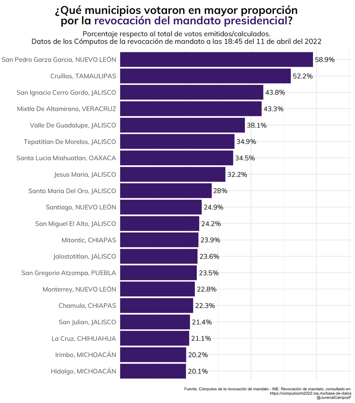 Los municipios donde más se apoyó la revocación del mandato se muestran en la siguiente gráfica. De estos, la revocación del mandato presidencial sólo alcanzó la mayoría de votos en San Pedro Garza García, Nuevo León, y en Cruillas, Tamaulipas.