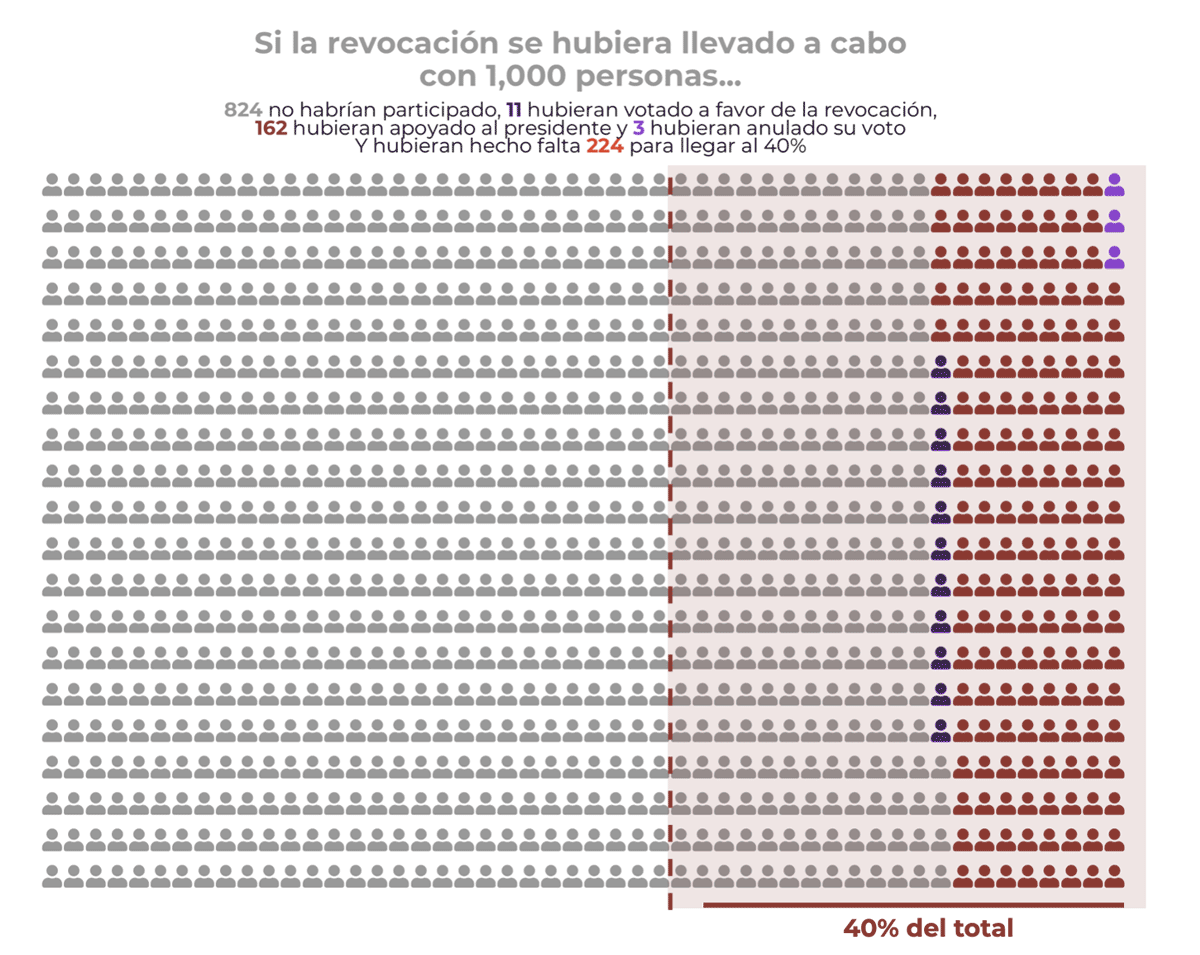 A pesar de los 16 millones de votos, este ejercicio no es vinculante dado que votó menos del 40 % del padrón electoral, además de que el porcentaje de electores que votaron por la revocación conformó el grupo minoritario. Poniendo las cifras nacionales en perspectiva, como puede verse en la siguiente gráfica, si la revocación se hubiera llevado a cabo con 1000 personas, 824 no habrían participado, 11 habrían votado a favor de la revocación, 162 habrían apoyado al presidente y 3 habrían anulado su voto. Y, aun así, habrían hecho falta 224 votantes más para llegar al 40 %.