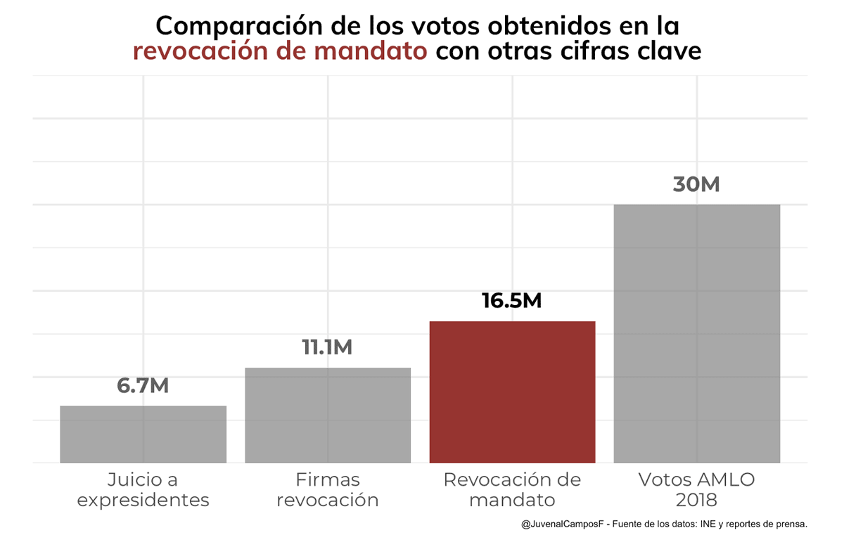 Algunos analistas llegaron a definir ciertas cifras de referencia para estimar el éxito de la convocatoria de la consulta. Éstas incluyeron los votos obtenidos por el presidente en 2018 (los 30 millones de votos), la cantidad de firmas recolectadas para iniciar el proceso de revocación y los votos de la consulta a expresidentes. Como se observa en la siguiente gráfica, la revocación de mandato logró superar la cifra de las firmas, pero apenas y llegó a la mitad de los 30 millones de votos conseguidos por el presidente en 2018.