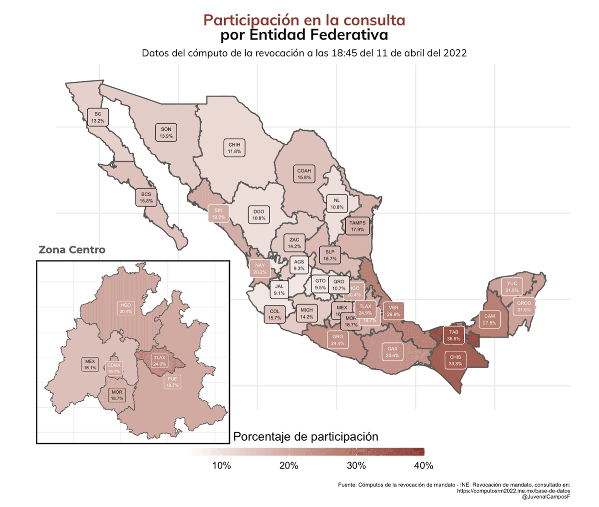 Para las entidades, se reportaron distintas tasas de participación, desde la más alta, conseguida en Tabasco —el estado natal del presidente—, hasta las más bajas, donde destacan los estados del bajío/centro occidente y los estados del norte de México. Si bien Tabasco quedó cerca de la meta, en ninguna entidad se logró alcanzar la marca del 40 % de participación electoral.